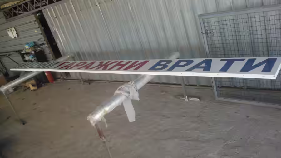 Дълга, правоъгълна табела с червен и син надпис на кирилица, подпряна на метални стойки в работно помещение с ламаринени стени.